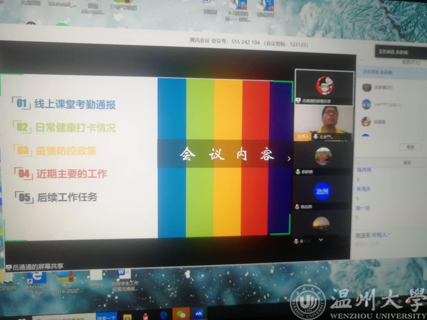 为进一步做好新冠肺炎疫情防控工作,维护开学前后学生身体健康及学校安全,4月17日晚19:00,纽约国际588888线路检测中心通过腾讯会议APP召开本学期“期中班主任工作网络主题会议”,此次会议由院党委副书记曾蓓蕾主持,学院全体辅导员、各年级班主任参加了此次会议。