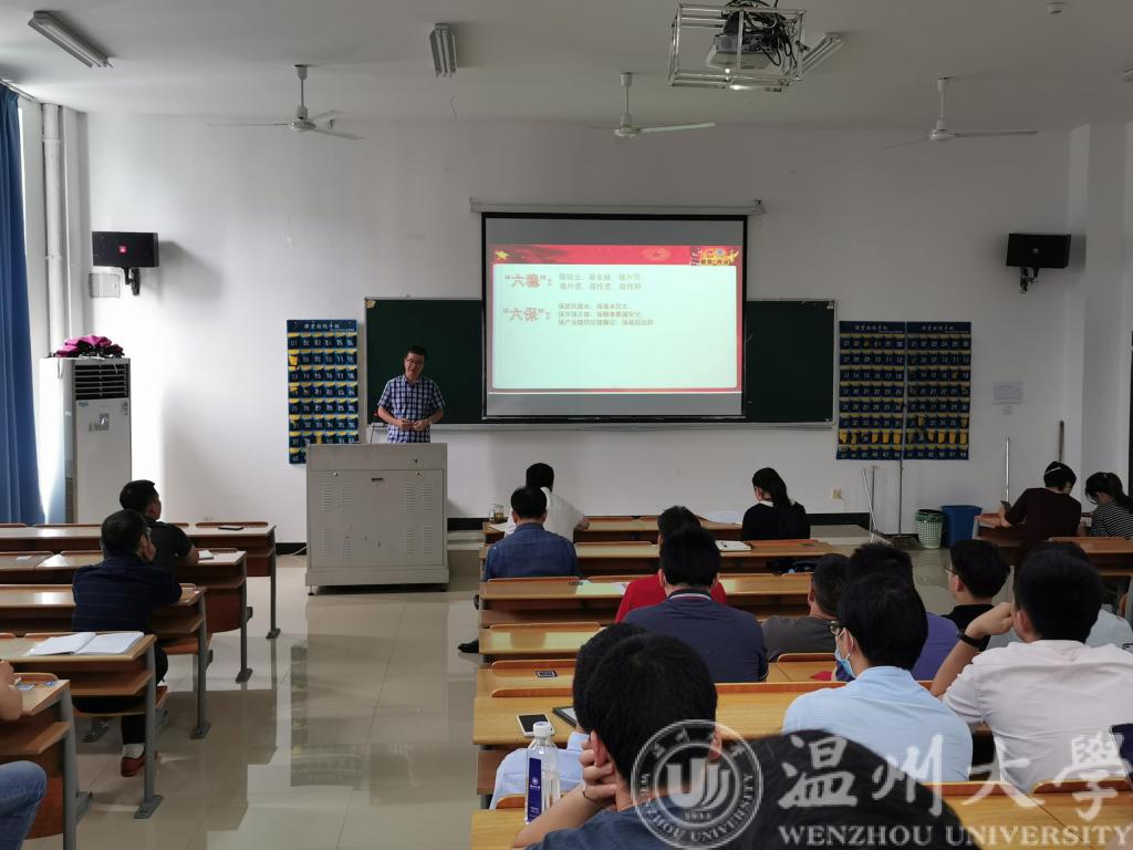 6月10日下午,纽约国际588888线路检测中心全体教职工政治理论学习会在1B402召开,这是疫情之后,学院教职工第一次线下学习会,学院党委书记李方强做2020年全国两会精神解读。