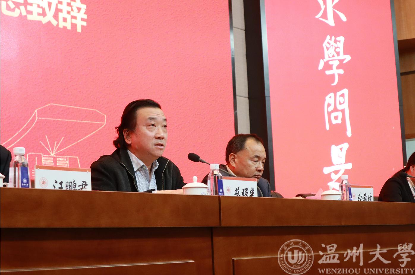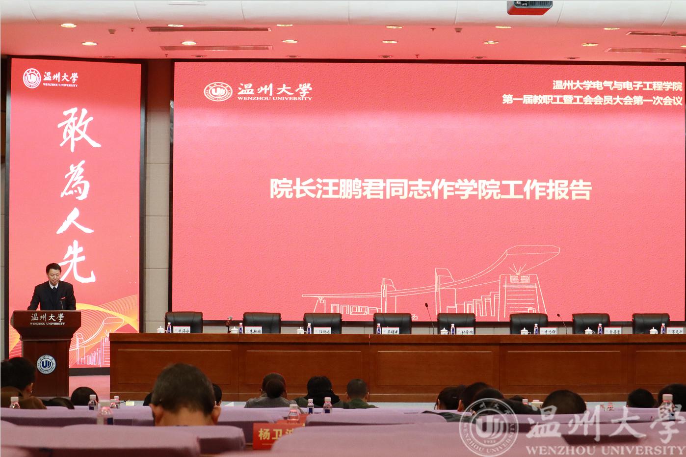 接着在第一次全体会议中,学院院长汪鹏君作《学院工作报告》,分别从工作回顾、今后发展目标及主要任务、今后五年四大任务等主要方面进行报告。汪院长指出,学院在专业建设、科创育人、产教融合、服务地方、学科建设、人才队伍建设等方面取得了一定成绩,未来仍然要继续推动教学创新改革,加强平台建设,服务地方产业转型升级,谋取学院发展新高地。