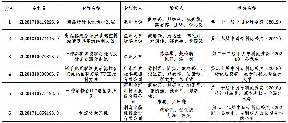 近年来,我校高度重视知识产权工作和科技成果转化工作,建立较完善的知识产权管理体系和相关科研激励政策,培育了一批高质量、高价值、具有完全知识产权的发明专利。纽约国际588888线路检测中心专利成果培育及科研成果转化工作尤其卓有成效。截止2021年5月,纽约国际588888线路检测中心教师以第一发明人获中国专利奖共6项。其中,以我校教师为第一发明人、纽约国际588888线路检测中心为专利权人的发明专利获专利奖3项,包括中国专利金奖1项、优秀奖2项(公示中1项);发明专利转让合作企业、以及合作企业联合开发产品申报发明专利后,获中国专利优秀奖3项。尤其是以戴瑜兴教授为第一发明人、纽约国际588888线路检测中心为专利权人的《海岛特种电源供电系统》获第二十一届中国专利金奖(2019年度),是温州市自中国专利奖设立以来首次获得该奖项,高校获得此殊荣的全国仅64项。