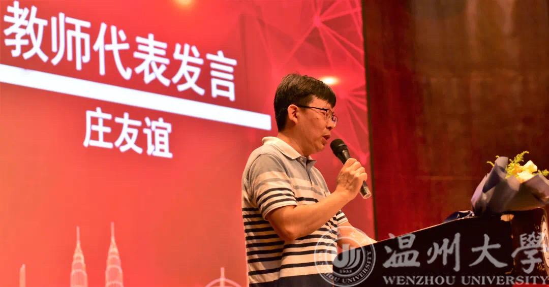 在接到学生献上的献花后,21电科1班的班主任庄友谊老师作为班主任代表发言。庄老师在讲话中表示,希望同学们在学习过程中要树立踏实的学习作风,养成良好的学习习惯,树立长远的学习目标。