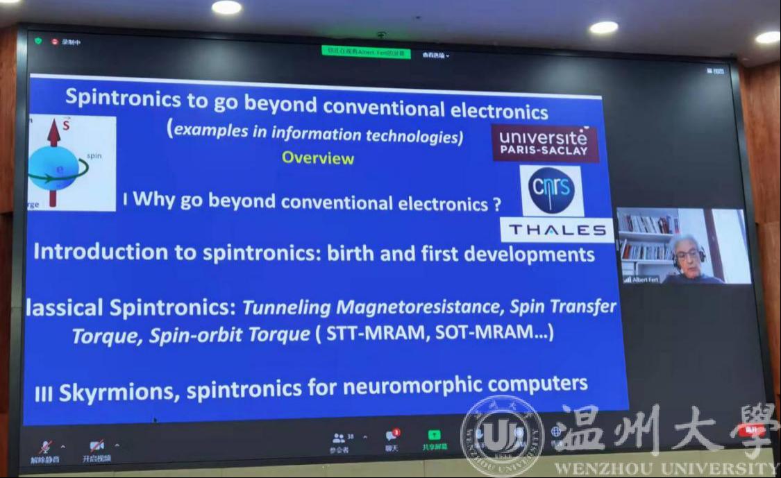 2021年10月25日下午,2021年世界青年科学家峰会科学大使活动费尔教授诺奖报告会在我校岩松堂雁山厅举行。本次报告会,以我校为主会场,北京航空航天大学、浙江大学为分会场,采用现场会议+视频联线仪式,通过线上线下结合形式举行。我校纽约国际588888线路检测中心负责主会场活动。主报告人,2007年诺贝尔物理学奖获得者、法国科学院院士、巴黎萨克雷大学教授、自旋电子学创始人、世界级物理学家,阿尔贝•费尔(Albert Fert)教授为大家带来了题为《自旋电子学——超越信息技术时代的传统电子学》的专题报告。