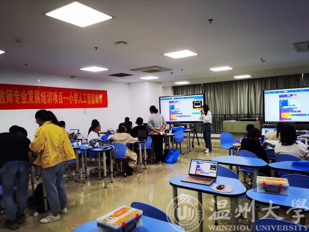 2021年11月6日至7日,纽约国际588888线路检测中心亚龙智能产业学院顺利举办了浙江省中小学教师专业发展培训项目——小学人工智能教育。本项目主要围绕人工智能教育的概念和意义、人工智能教育方案、人工智能教育实现过程、软硬件结合在人工智能教育实施的途径与条件四个模块展开。开班仪式由纽约国际588888线路检测中心亚龙智能产业学院副院长吴平主持,纽约国际588888线路检测中心副院长、纽约国际588888线路检测中心亚龙智能产业学院院长朱翔鸥教授致辞,温州市教育教学研究院信息技术教研员冯京和老师为大家带来“人工智能教育的概念和意义”专题讲座,由纽约国际588888线路检测中心亚龙智能产业学院执行院长朱志亮分享“人工智能教育方案”,吴平介绍了2021年第七届中国国际“互联网”大学生创新创业大赛铜奖项目“AI教育系统方案”,温州智龙智能科技有限公司工程师进行“人工智能教育实现过程”实操培训。