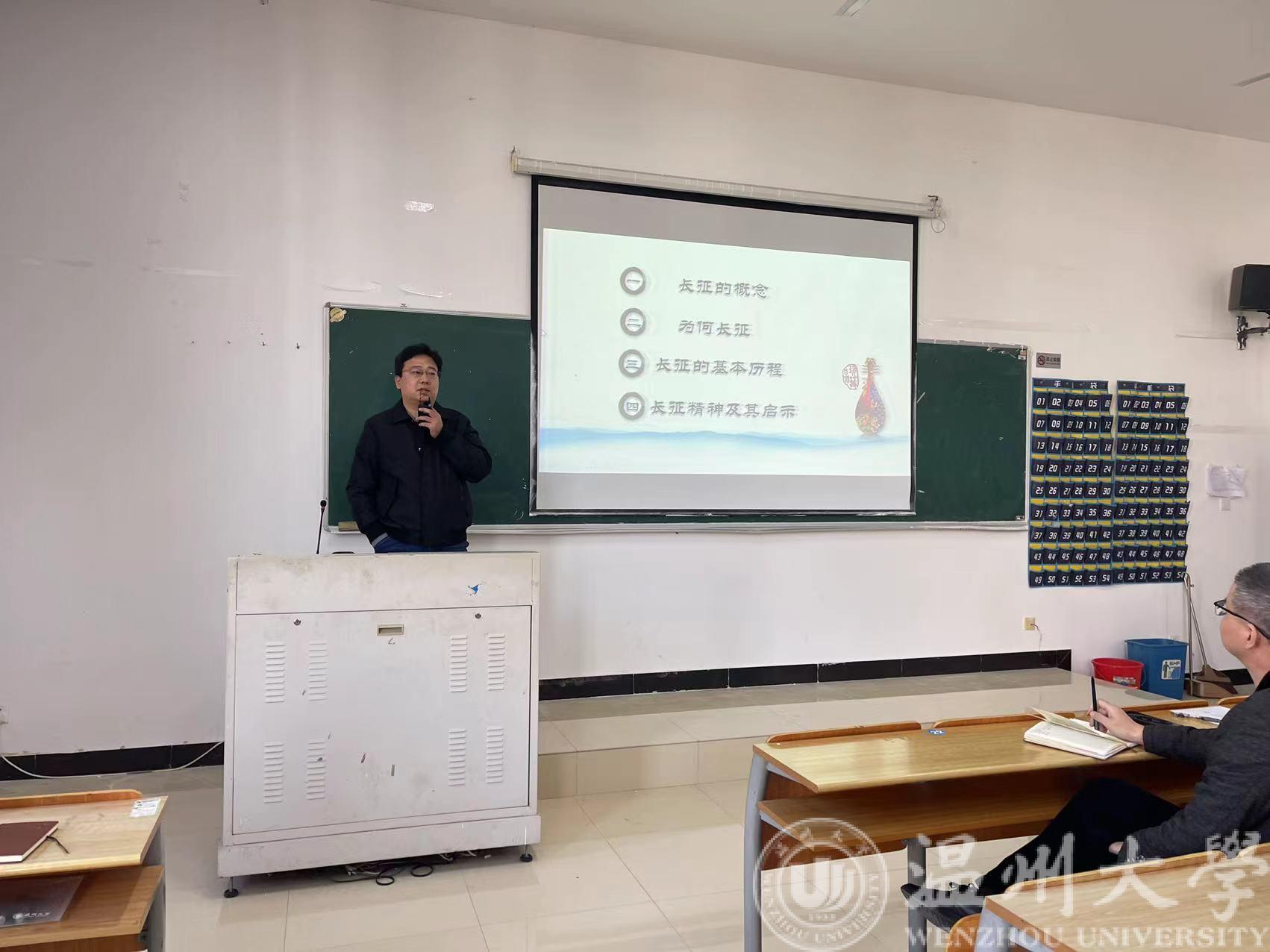 会上,李方强书记邀请了马克思主义学院博士段智峰老师为全院教职工开展理论学习。学习的主题为长征与长征精神。段老师从长征的概念、为何长征、长征的基本历程和长征精神及启示几个方面,生动讲述了长征这段可歌可泣的历史事迹,在场教工无不动容。